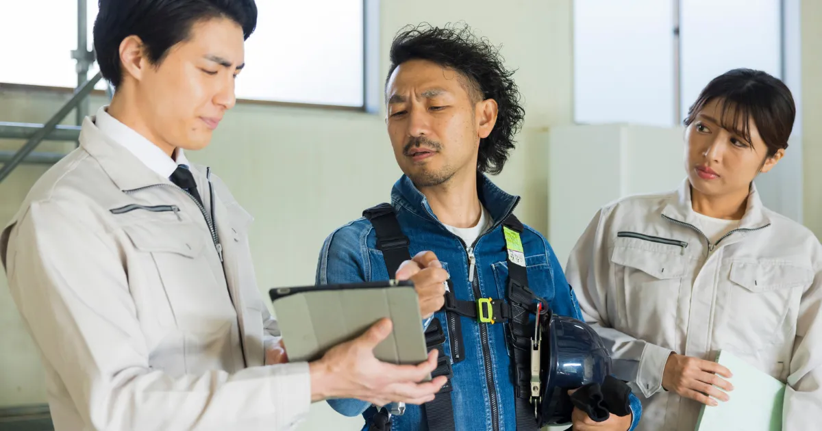 建設現場、仮設事務所、屋外作業。