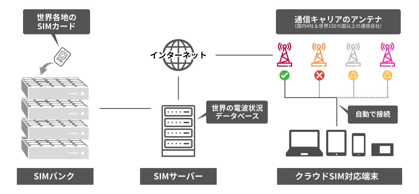 クラウドSIMとは、端末に物理SIMカードを挿さなくても、国内外の通信回線に接続できる仕組みです。