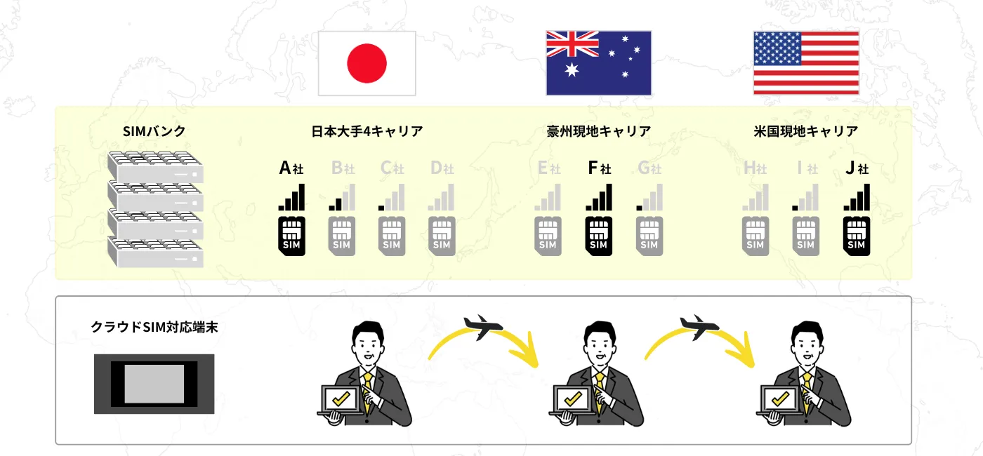 端末は、その時いる場所や電波状況にもとづいてクラウドにアクセスし、最適な通信事業者(キャリア)の回線情報を取得して接続します。